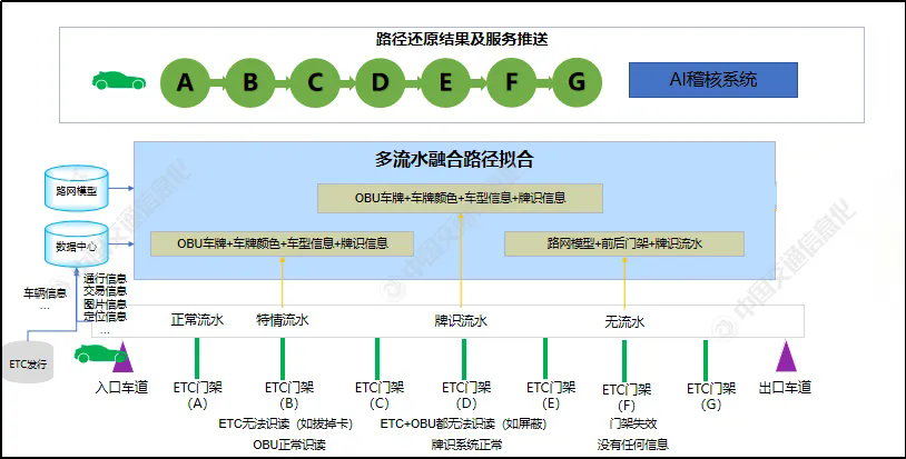 本文针对ETC识读率低、牌识流水与抓拍率低、假冒减免车辆、套牌、路径作弊等收费问题,搭建了AI稽核系统平台,实现了多源异构数据的采集、存储、处理与分析。在深度融合ETC门架、收费站等流水和图像信息的基础上,提出了多流水融合路径拟合方法真实还原了通行过程车辆信息,为偷逃漏通行费稽核提供了完整证据链。同时,深度分析了所辖区域2020年5月至2021年12月间数据,结果表明,AI稽核系统模型准确率较高,可有效防范和遏制偷逃漏通行费行为,提升稽核追缴成功率。