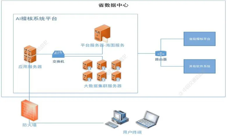 数据源是开展收费稽核工作的基础,包括通行、交易、牌识、视频等采集数据和车辆发行、路网、费率、节点等基础数据,具体如下[8]。1、车道收费数据具体包括车道收费交易数据和车道牌识数据,其中车道收费交易数据包括出入口站点、出入口时间、车牌、车型、轴重、轴数、行驶里程、收费金额等;车道收费牌识数据包括收费站编号、抓拍时间、识别车牌号、识别车型、抓拍图片等。2、门架计费数据和牌识数据具体包括门架计费交易数据和门架牌识数据,其中,门架计费交易数据包括入口信息、交易时间、车型、车牌、计费里程、计费金额等;门架牌识数据包括门架编号、抓拍时间、识别车牌号、识别车型、拍摄位置、抓拍图片等。3、发行数据包括ETC和OBU的发行数据,具体包括发行省份、发行时间、车牌、车型、颜色、图片、轴数以及办理人的相关信息。4、跨省拆分数据包括车辆跨省通行的车辆通行数据和收费数据,具体包括车辆通行收费站出入口数据、车道交易数据、门架计费数据等信息。5、全省治超数据和治超牌识数据主要包括车辆通行数据、计重数据和牌识数据,具体包括车辆通行时间、车牌、车型、轴重、轴型、图片等数据。(二) AI稽核系统设计思路1、AI稽核网络拓扑AI稽核系统采用了大数据集群服务器、地图引擎服务器、应用服务器,网络拓扑如图2所示。其中,大数据集群服务器主要对收费数据、发行数据、拆分数据、治超数据、牌识数据接收、存储以及对稽核模型、路径还原等进行计算,还能通过倒排索引对数据进行高性能检索;地图引擎服务器主要实现地图图层加载、路网模型计算;应用服务器主要实现对AI稽核系统的部署和接口的数据交互。