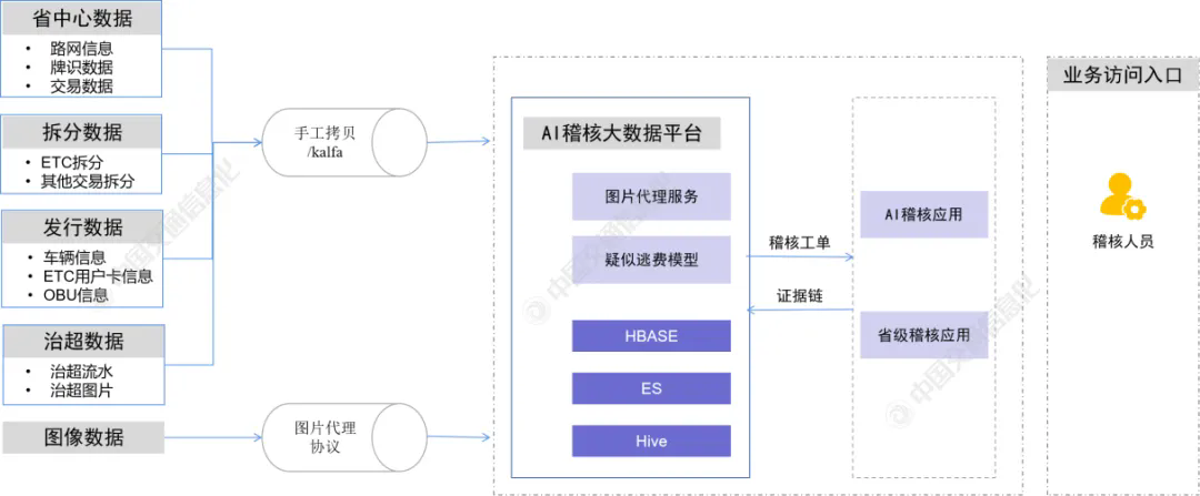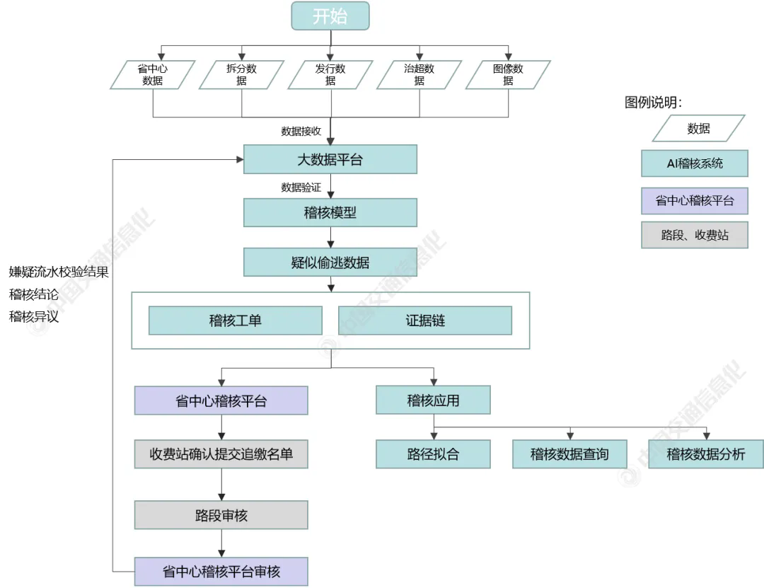 同时,鉴于数据存储介质、数据存储类型和数据传输方式的差异,通过不同工具实现异源、异构数据的导入。其中,对实时性要求较高的监测数据以分布式消息队列的形式由Kafka分发;关系型数据库由Sqoop等工具直接将数据导入HDFS;非实时性数据选择MapReduce计算引擎,实时性要求较高的数据选择Spark或Storm计算框架。3、AI稽核系统流程AI稽核系统流程如图4所示,可分为4个步骤:(1)省中心数据、拆分数据、治超数据、发行数据等接收汇聚至大数据平台,通过稽核模型数据验证,得到疑似偷逃费数据;(2)系统根据疑似偷逃费数据,自动匹配生成稽核工单和证据链,并推送至省中心稽核平台及稽核应用;(3)省中心稽核平台将稽核工单和证据链推送至收费站,一线稽核人员确认后提交追缴工单,工单提交至路段和省中心进行审核;(4)省中心稽核平台审核完毕后,生成追缴名单,并反馈校验结果、稽核结论等至AI稽核系统。