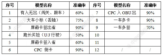 (四)稽核模型建立与准确率验证本文所述AI稽核系统根据不同逃费类型建立对应模型,目前已实现大车小标、有入无出、屏蔽卡签入省、屏蔽卡签出省、跑长买短、CPC倒卡、CPC入OBU出、一车多卡、一车多签等近10种偷逃费行为稽核。以大车小标偷逃费行为进行举例说明。改变车型(车种):大车小标是指发行车型跟实际车型不符。通过非法手段办理或套取使用与实际车型不符的车辆标签,达到偷逃费的目的。稽核数据验证方式如下:(1)通过交易数据中的车牌、车牌颜色和车型与发行数据对比,确定大车小标;(2)利用入口称重数据,在收费数据中的入口交易数据搜索轴数与车型不符的车辆;(3)搜索收费数据中的入口交易数据,车型为一型货车,且车牌颜色为黄色的车辆;(4)筛选车辆通过ETC专道和人工车道的收费车型存在不一致的情况,通过车牌号筛选某个车牌多次出现两个及以上的车型的车辆;(5)对筛选出的车辆,根据大数据平台图片、交易数据,对特征点进行对比分析,形成初步结论。通过对稽核模型分析数据与稽核人员核实数据对比分析,进行稽核模型分析筛查准确率验证,稽核模型准确率如表2所示。屏蔽卡签、倒卡通行介质等稽核模型准确率较高,达90%,有入无出(闯关、跟车)、跑长买短(U/J行驶)因系统及计费规则、现场管理和证据获取等多重因素影响,准确率为50%~60%左右,但能够满足稽核业务需求。稽核模型准确率如表2所示。