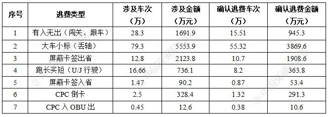 分析可得,有入无出(闯关、跟车)、大车小标(丢轴)、屏蔽卡签出省和跑长买短(U/J行驶)等4种逃费类型分别占据涉及行程数的96.87%、疑似损失金额的95.9%,是稽核系统需加大核查力度的逃费类型,特别是屏蔽卡签逃费车次占为11%,逃费金额占比却达25%,以全网联网收费运行模式下出现的新型逃费类型,需要从技术、管理等多方面加强管理。有入无出(闯关、跟车)和跑长买短(U/J行驶)2类逃费类型确认逃费金额占比有所下降,直接原因是稽核模型准确率不高。下一步应持续优化迭代这2类模型,尽可能提高其准确率,从而不断提高可追缴比例。