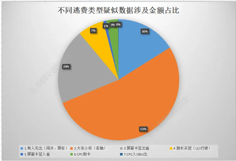 利用AI 稽核平台对山西省2020年5月6日至2021年12月31日通行数据进行全量分析,共筛查累计筛查疑似逃费车辆67.3万台、涉及行程约141.5万车次、涉及总金额1.05亿元,根据稽核模型准确率测算,预测逃费车次95.8万车次,预测逃费金额0.75亿元,截至2022年1月底,各高速公路运营公司稽核人员完成全部疑似逃费数据审核,完善证据链,最终确认逃费车次93.5万车次,确认逃费金额0.74亿元,已追缴5500余万元。具体按逃费类型分析如下。对大车小标、有入无出(闯关、跟车)、屏蔽卡签入省、屏蔽卡签出省、跑长买短(U/J行驶)、CPC 自倒卡、CPC 入 OBU 出等7种逃费类型进行分析,各类型对应涉及行程数、涉及金额及确认逃费金额如表3所示,疑似逃费涉及金额占比如图6所示,确认逃费金额占比如图7所示。